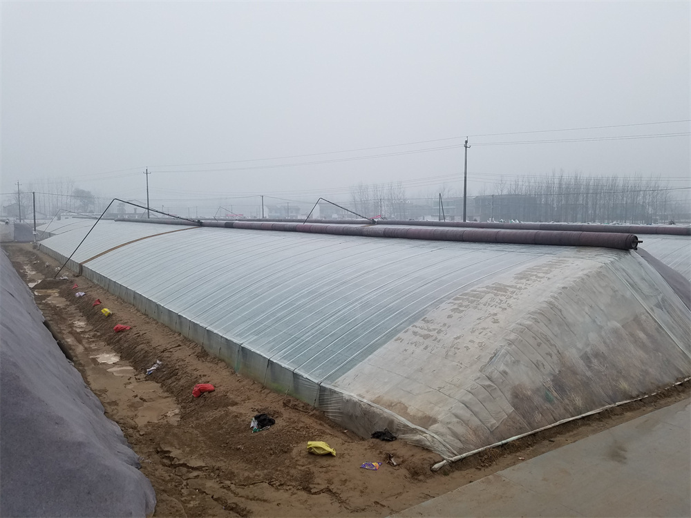 ⑷建棚頭。在兩端的拱架下,插入4-6個(gè)支柱,將支柱與棚架綁在一起形成棚頭,在背風(fēng)處棚頭中部設(shè)門,門寬0.7米,高約1.3-1.5米。為減輕風(fēng)對(duì)膜的損壞,迎風(fēng)的棚頭可采用逐步降低棚架高度的辦法過渡。